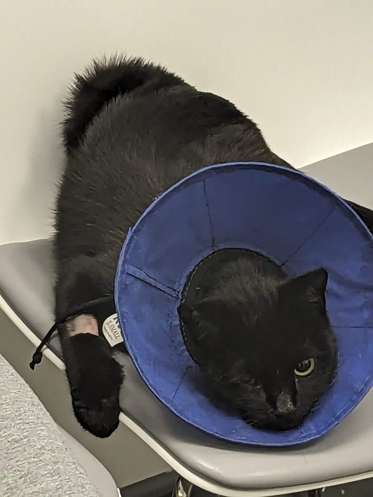 Wound: please check the wound twice a day and contact us if it becomes red, swollen, starts to discharge or open up. Mango must wear a buster collar at all times if he tries to scratch at the wound until the wound is all healed/until it has been re-examined in 12-14 days’ time as detailed below.